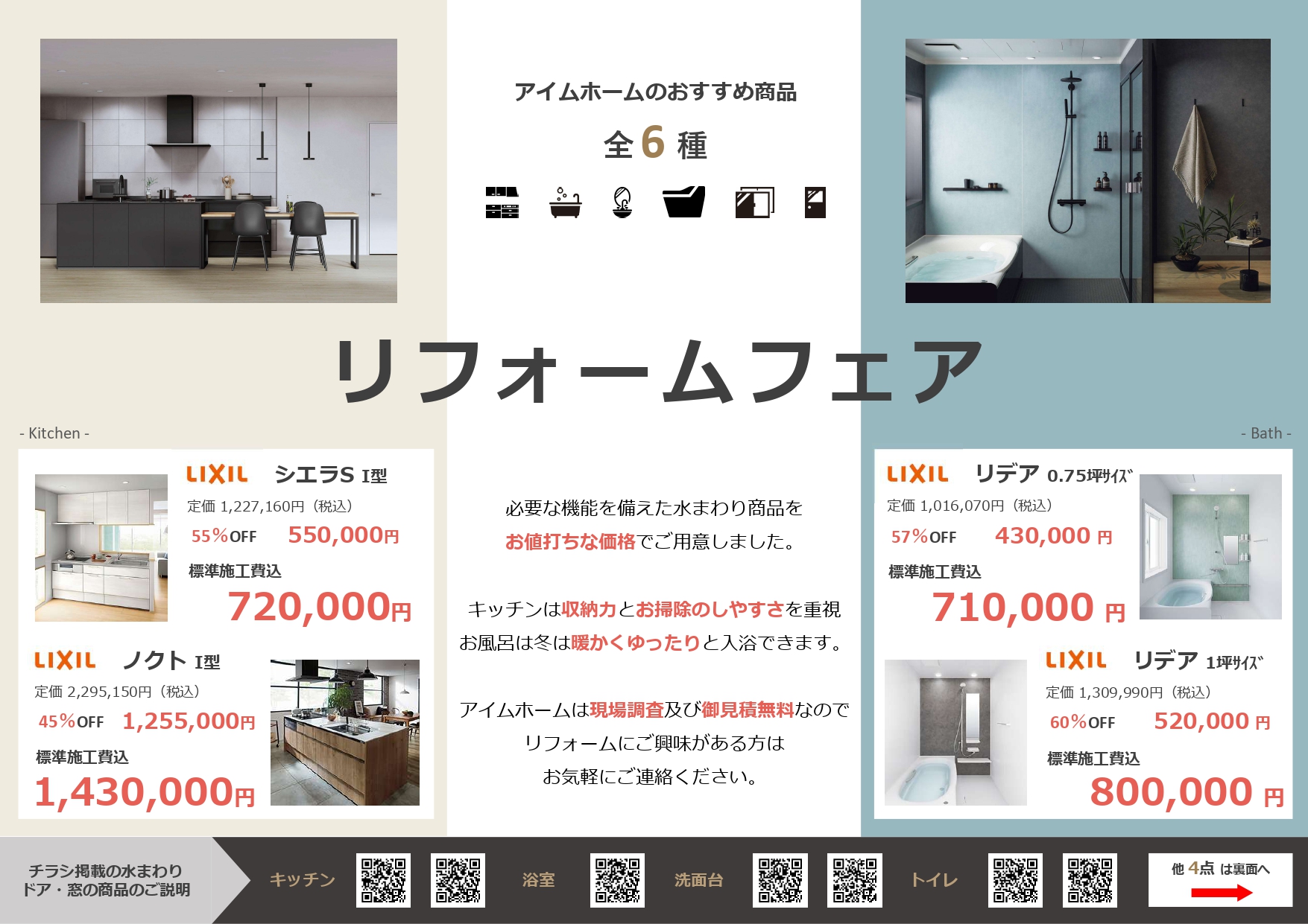 HOME - お知らせ - イベント - リフォームフェア お知らせNews アイムホームが叶えるあなたがのぞむ住まい イベント 2025.12.23 リフォームフェア アイムホームがおすすめする冬のリフォームフェア 水まわり4点(キッチン・ユニットバス・洗面化粧台・トイレ) ドア・窓2点になります。 他にもご家庭でのお困り事などあればいつでもご相談ください。 お知らせ一覧に戻る
